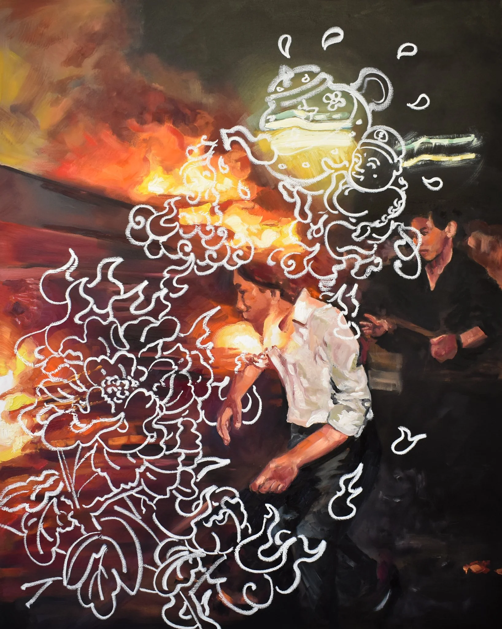 In actuality, I have asked my mom about 1989 before. That was the year of the Tiananmen Square Massacre, the student protest that ended in devastation and changed the political and cultural landscape of an entire generation. My mom mentioned this story to me when I asked her about the protest. Her younger brother was out in the streets when the government began the violent crackdown. She had no idea where he was. She didn’t continue to explain any further, but years later I would be sitting across from Mr. Ma hearing the same story from his perspective. He was the one who found my uncle and brought him back to my mom unharmed. What always struck me was how both my mom and Mr. Ma would recall these memories while brushing it off with a smile, casually speaking of it as if it was just something that happened. Part of me wants to unravel what kind of impact that time in their life amounted to, but we don’t speak of trauma. We continue forward, brushing it off with a smile. This is our relationship. However, I’ve come to accept it. I sit and listen, take in what I can, and acknowledge that I will never get the full picture. I lean into the cultural distances experienced inside a diaspora, and how much it takes to regain those. Perhaps these paintings too are a moment of sitting and listening. Not quite inserting myself asking for more and more clarity, but instead embracing the messiness that comes with the yearning desire to understand one's inherited histories.